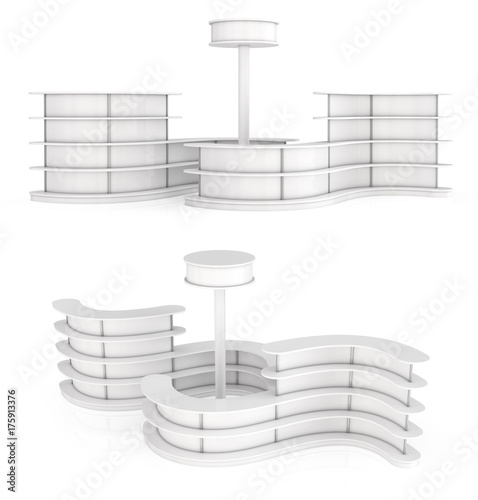 Curved shelving with shelves for exhibitions and sales. 3d images set