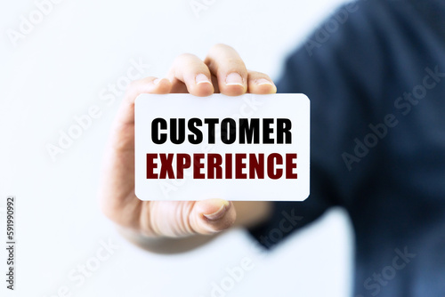 Customer experience text on blank business card being held by a woman's hand with blurred background. Business concept about customer experience.