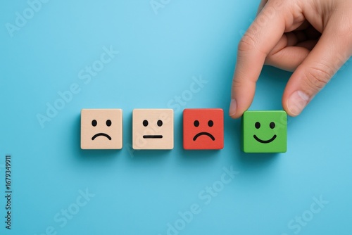 Customer Feedback Concept: Hand Selecting Positive Emotion Block Among Negative Ones on Blue
