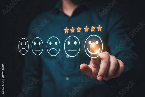 client, satisfaction, survey, feedback, rating, life events, star, review, online, business, service, quality, concept, hand, touch, finger, choice, select, mark, evaluation, assessment, opinion, positive, negative, emotion, face, expression, happy, sad, neutral, icon, symbol, graphic, illustration, digital, technology, cyberspace, marketing, communication, success, improvement, growth, value, performance, indicator