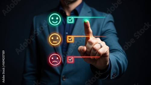 satisfaction, client, survey, feedback, online, form, happy, sad, neutral, face, rating, life events, business, service, review, evaluation, check, mark, tick, finger, touch, interface, digital, technology, man, suit, neon, glowing, positive, negative, assessment, choice