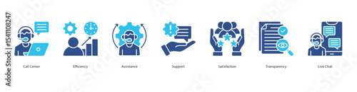 Customer Support Services banner web icon set vector illustration concept with icon of call center, efficiency, assistance, support, satisfaction, transparency, live chat