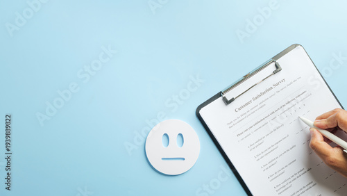Customer survey form, gathering crucial customer satisfaction feedback, essential business data collection on paper checklist, contributing to service improvement review, depicting neutral face