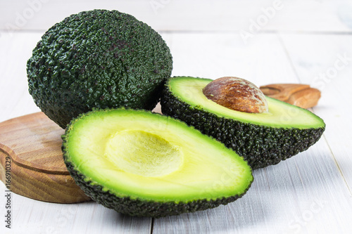 Cut and whole avocado on a wooden board on a white background.