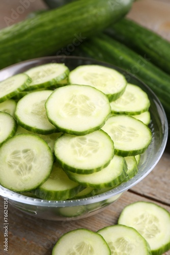 Cut cucumber in glass bowl and fresh vegetables on wooden table, closeup