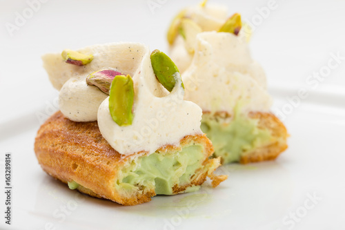 eclair, cafes, background, french, delicious, dessert, sweet, snack, cooking, cream, cake, pastry, traditional, food, closeup, white, fresh, cookery, bake, bakery, berry, bun, cream puff, creamy, culinary, custard, filled, filling, france, homemade, patisserie, profiterole, cotton balls, receipe, stuffed, vanilla, whipped, yellow, chef, european, luxury, decorated, decoration, pistachio, cut, green