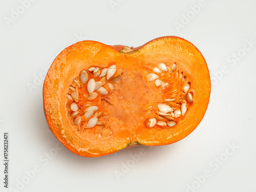 Cut pumpkin on white background. Fresh ingredient for autumn recipes.