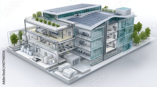 Cutaway 3D render of a green hospital with solar-powered backup, rainwater harvesting tanks, smart meters, and energy-efficient lighting.