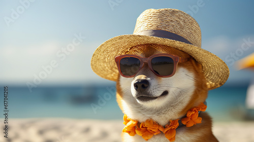 Cute adorable shiba inu dog wearing sunglasses and straw hat at sunny beach and seaside in summer. Digital illustration generative AI.