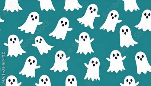 Cute and funny seamless Halloween pattern with cartoon animal ghosts, cats, and dogs for a fun wallpaper design