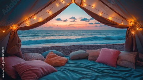 Cute and inviting tent interior with pastel cushions, fairy lights, and a view of the waves through open flaps