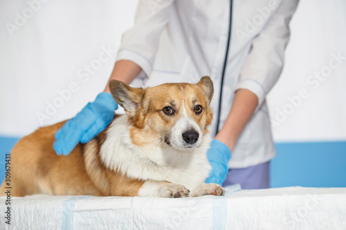 cute and scared puppy dog Corgi lying on the table on the table examination by a veterinarian in the clinic