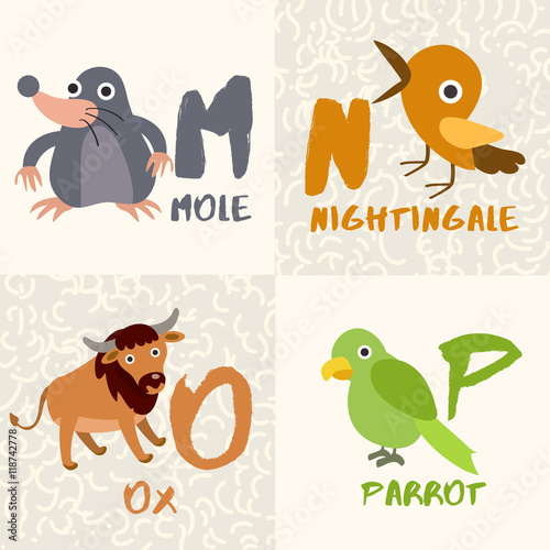 graphic, design, vector, illustration, character, zoo, animal, alphabet, letter, set, collection, style, stylish, learn, children, colourful, school, vocabulary, cartoon, friendly, education, background, wildlife, study, english, language, art, pet, layout, cute, children, baby, funny, font, typography, happy, isolated, wildlife, smile, word, adorable, lovely, drawing, mole, nightingale, ox, parrot
