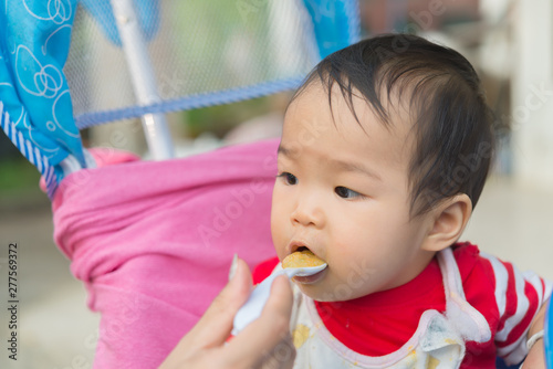 Cute asian baby girl eatting rice with mom,Thailand people,Time for foods
