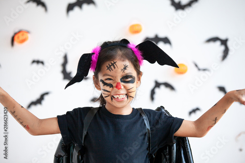 Cute asian child girl wearing halloween costumes and makeup having fun on Halloween celebration