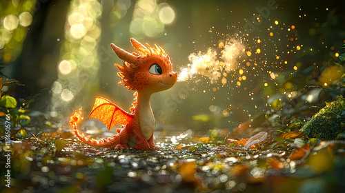 dragon, cute, baby, fire, forest, magical, fantasy, mythical, creature, adorable, whimsical, playful, charming, sweet, innocent, tiny, small, little, timberland, nature, scene, spark, glowing, light, bright, shiny, shimmer, glistering, amber, orange, red, brown, green, leaf, ground, bokeh, background, digital, art, illustration, rendering, three-dimensional, image, picture, graphic, design, artwork, fairy tale, story