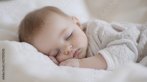 Cute baby sleeping soundly on cozy white blanket capturing innocence and warmth in a serene moment : Generative AI