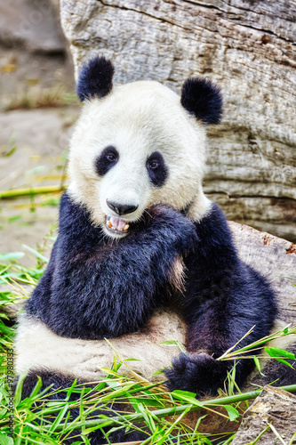 Cute bear panda actively chew a green bamboo sprout.