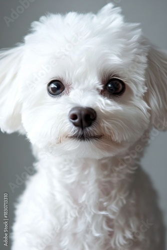 bichon, dog, puppy, mammal, animal, canino, pet, portrait, white, fur, furry, face, head, eye, nose, background, grey, studio, shot, domestic, breed, companion, adorable, cute, happy, innocence, joy, gaze, charme, pose, small, friends, lovely, looking
