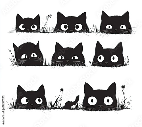 Cute black cats peeking through grass, showcasing playful expressions and various eye shapes in a whimsical illustration.