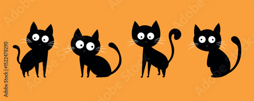 Cute black cats silhouette cartoon set on orange background, Halloween and pet-themed illustration