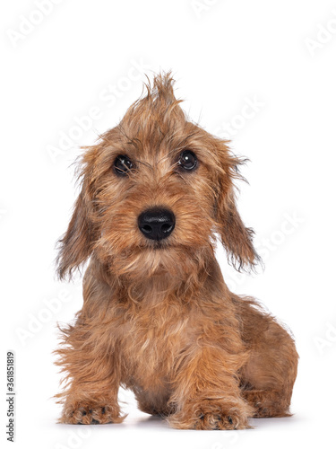 Cute blond mini Wirehair Kanninchen Dachshund pup, sitting up facing front. Hair in funny mohawk. Looking at lens. Isolated on white background.