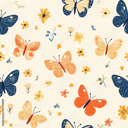 Cute butterflies on a pastel background with small flowers seamless pattern on background for fabric, curtain, wallpaper, clothing, wrapping, vector