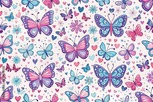 butterfly, pattern, spring, wallpaper, children, floral, heart, pink, white, purple, blue, cute, background, insect, flying, butterfly, flower, design, decoration, children, baby, girl, boy, childcare center, room, textile, fabric, print, illustration, pastel, pretty, delicate, whimsical, nature, art, image, photo, graphic, element, motif, bright, cheerful, vibrant, happy, playful, sweet, lovely, adorable, charming