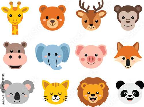 Cute cartoon animal face icons set, flat vector wildlife characters for kids, emoji style zoo animals illustration collection pack design
