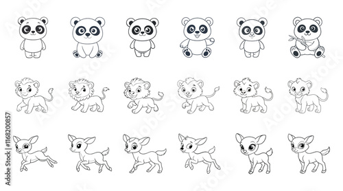 Cute cartoon baby panda lion and deer animals vector outline bundle set on white background
