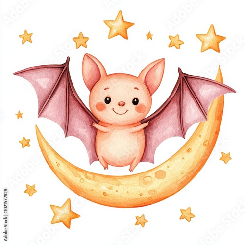 Cute cartoon bat with pink wings flying on a crescent moon surrounded by stars, perfect for children's designs.