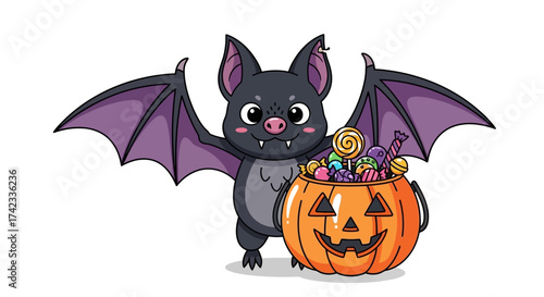 Cute cartoon bat with pumpkin full of candies, halloween illustration season theme