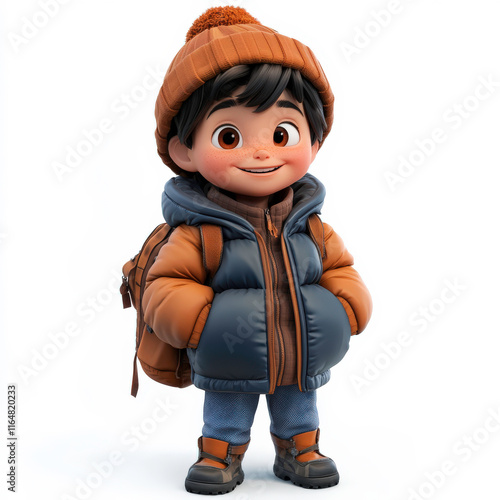 cartoon, boy, character, winter, clothes, hat, backpack, smiling, playful, cheerful, cute, children, happy, fashion, baby, children, childhood, people, fun, face, cold, person, beauty, smile, clothing, cap, little, happiness, toddler, jacket, joy