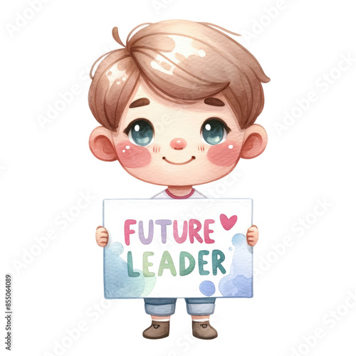 Cute cartoon child holding a sign that says 'Future Leader', symbolizing motivation, potential, and youth leadership, isolated on transparent background.