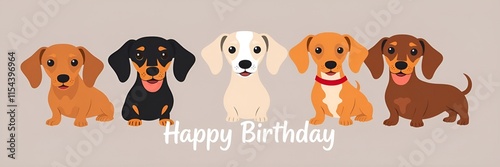 Cute cartoon dogs celebrating with "Happy Birthday" text on a neutral background