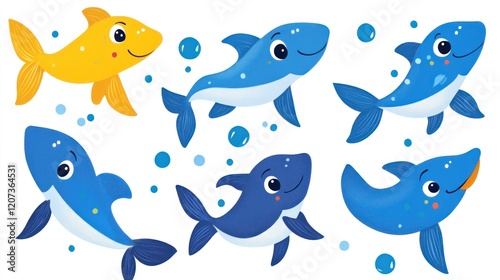 fish, shark, cartoon, cute, underwater, ocean, sea, aquatic, animal, wildlife, marin, illustration, graphic, design, art, colourful, happy, swimming, playful, joyful, adorable, children, children, baby, toddler, fun, bright, vibrant, summer, water, bubble, gold, blue, smile, fin, tail, scale, nature, creature, drawing, image, picture, vector