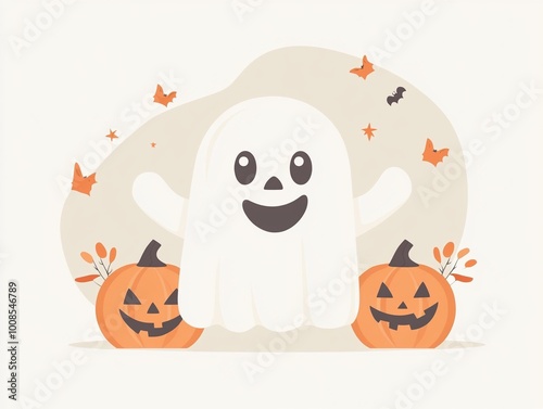 Cute cartoon Halloween ghost with pumpkin Jack-o'-lantern.