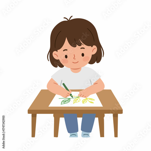 Cute Cartoon Little Girl Drawing Flower on Paper Illustration