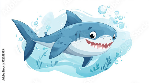 shark, cartoon, underwater, ocean, sea, fish, animal, marin, cute, happy, smile, friendly, swimming, bubble, water, blue, white, illustration, graphic, design, vector, clip art, character, mascot, children, children, baby, marine animal, marine animal