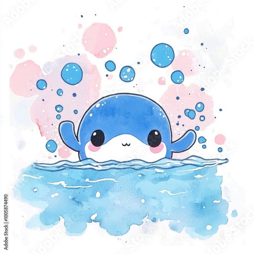 whale, cartoon, cute, illustration, watercolor, animal, ocean, sea, water, blue, pink, bubble, adorable, art, drawing, marin, mammal, wildlife, nature, childish, happy, playful, cheerful, whimsical, fantasy, design, greeting card, print, poster, background