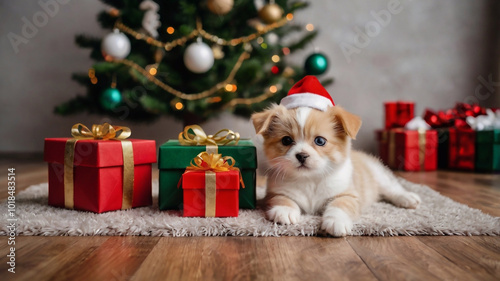 Cute cat and dog puppy with christmas gift boxes on wooden floor, Christmas concept