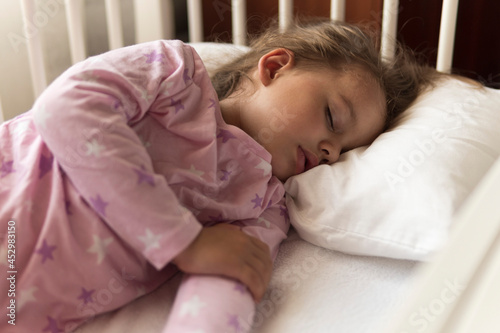 Cute cheerful little 3-4 years preschool baby girl kid sleeping sweetly in white crib during lunch rest time in pink pajama with pillow at home. Childhood, leisure, comfort, medicine, health concept