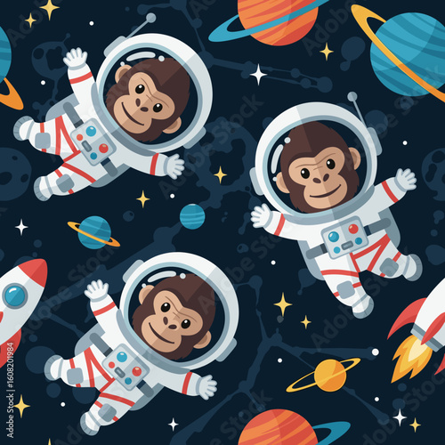 chimpanzee, monkey, astronaut, space, planet, star, rocket, cartoon, cute, illustration, seamless pattern, background, galaxy, cosmos, universe, fun, adorable, children, children, vector, design, textile, fabric, wallpaper, print, artwork, playful, whimsical, happy