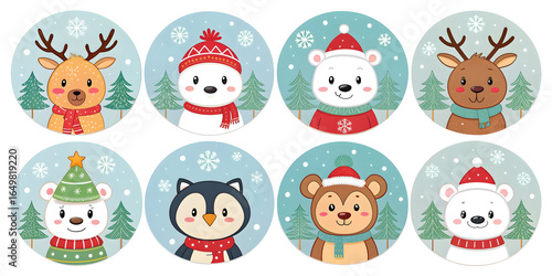 Cute Christmas animals including reindeer polar bear penguin and monkey wearing winter hats and scarves in snowy forest scenes