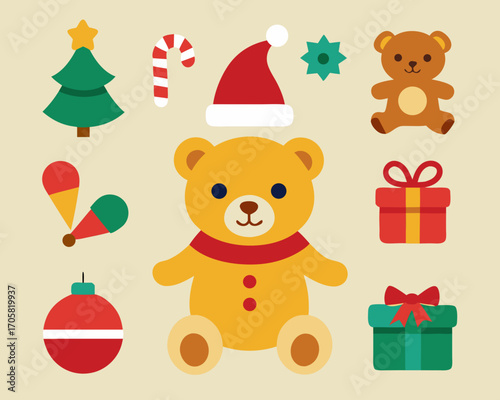 christmas, icon, teddy bear, gift, present, christmas tree, candy cane, ornament, holiday, winter, celebration, festive, cute, cartoon, vector, illustration, graphic, design, element, symbol, decoration, toy, bear, red, green, yellow, christmas eve, new year