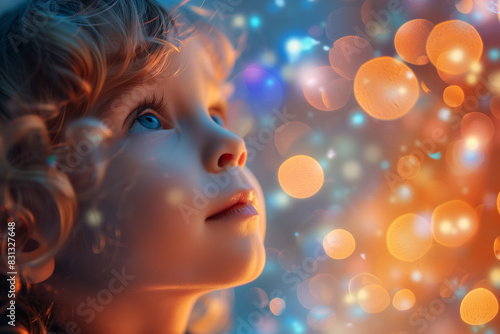 Cute curly little boy looks up in surprise at magical golden bokeh. Close up portrait with place for text. Atmosphere of magical holiday, happy childhood, children's day