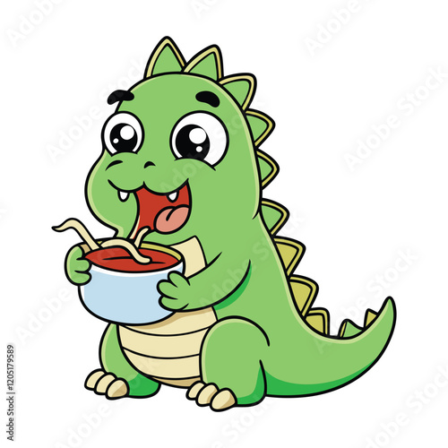 Cute Dinosaur Eating Noodles Vector Cartoon Illustration