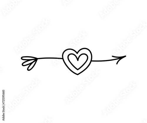 Cute doodle arrow with heart isolated on white background. Vector hand-drawn illustration. Perfect for Valentines Day designs, cards, invitations, decorations.