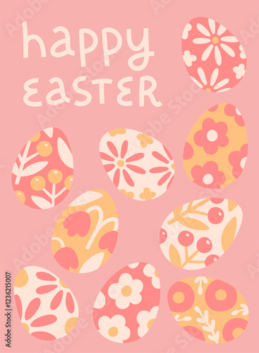 Cute Easter greeting card template. Happy Easter. Eggs decorated with flowers on pink background. Vector illustration