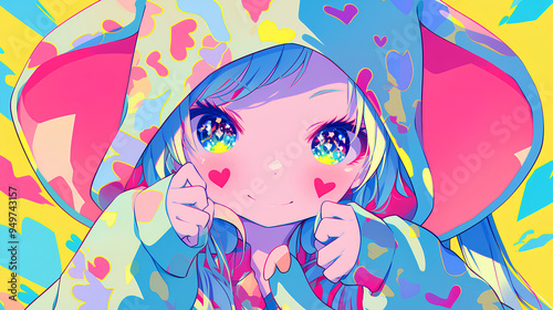 cute elephant character wearing anime onesie costume, anime style, cute kawaii, simple, smiling happy. neon psychedelic background